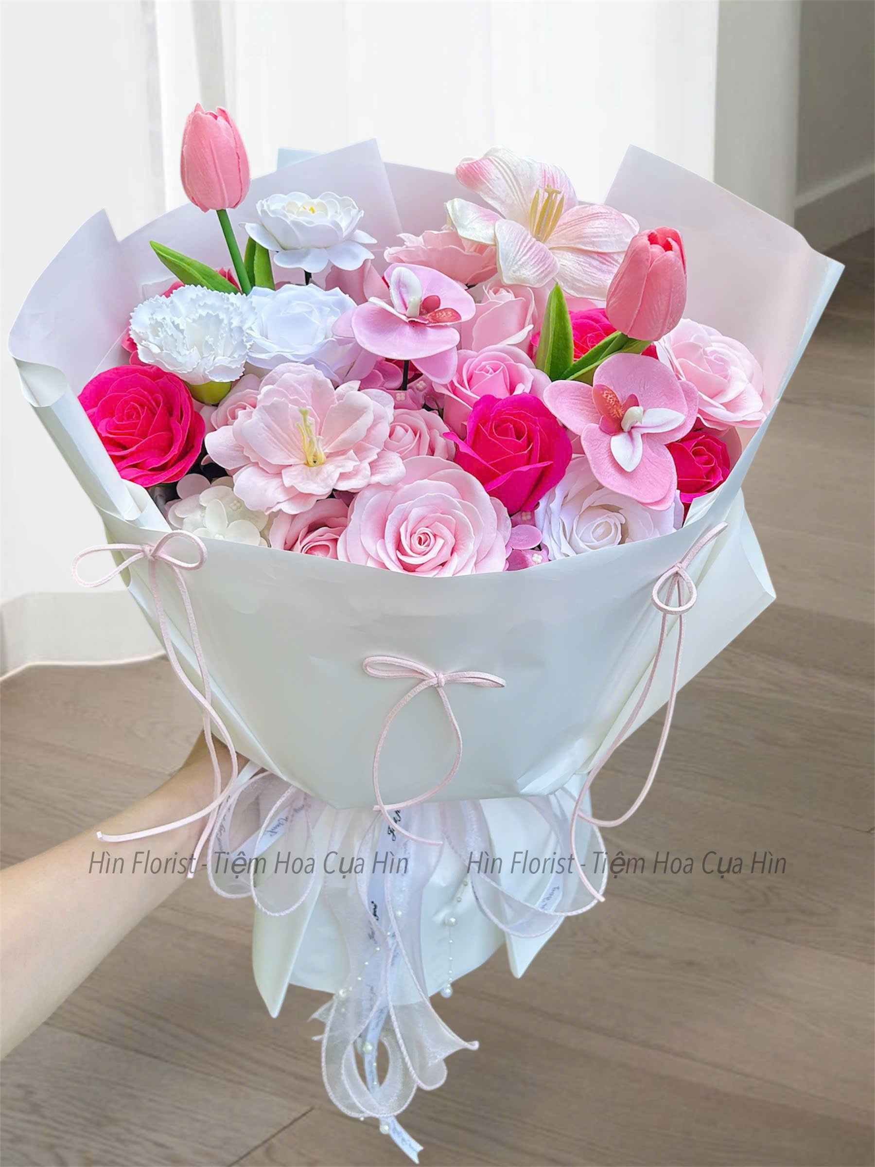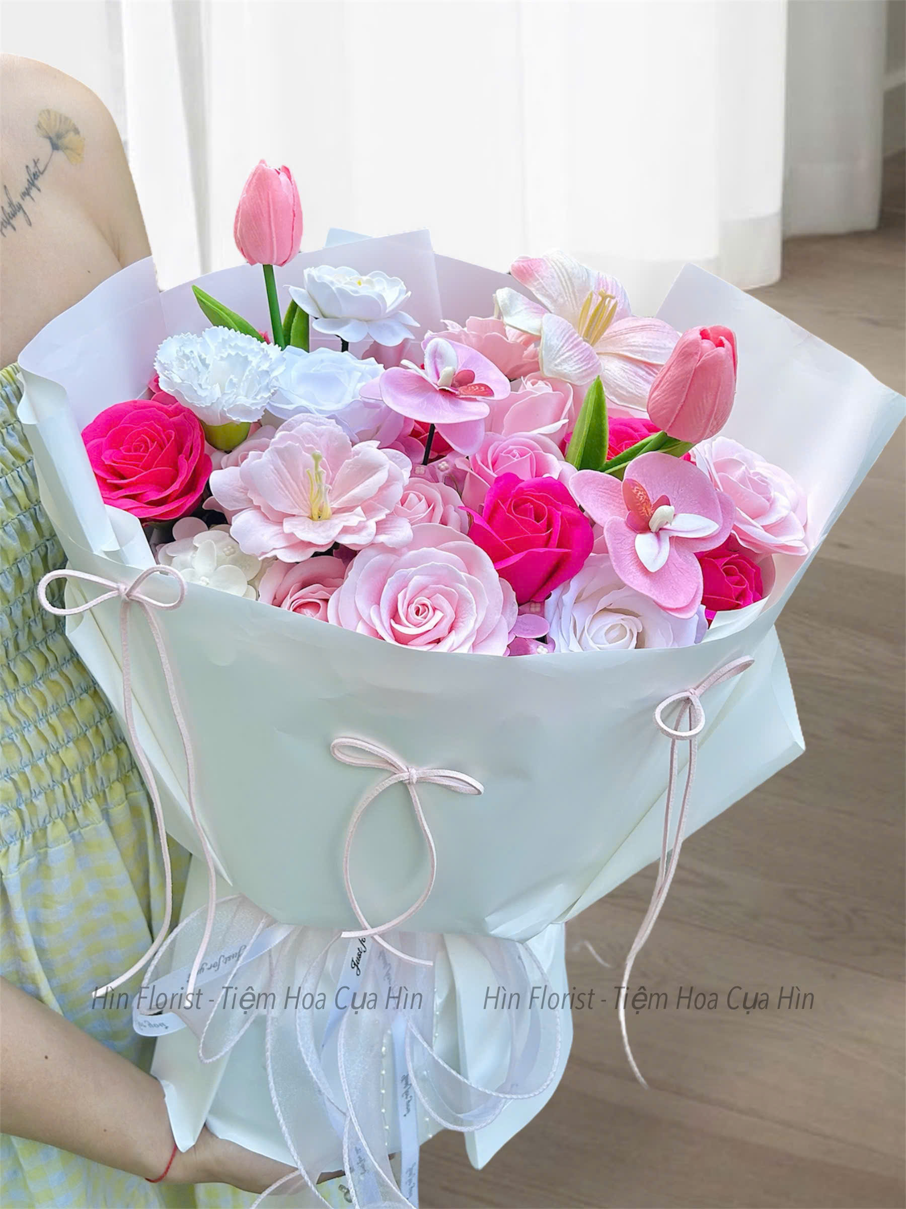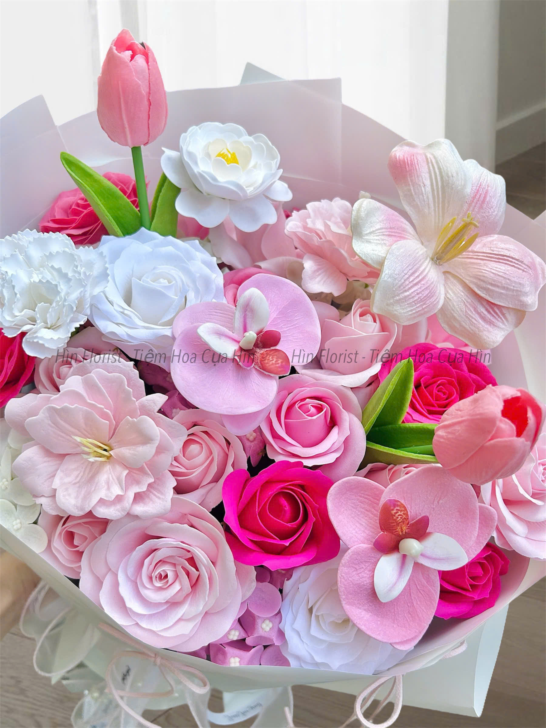 Bó hoa sáp mix hồng sen được tạo nên từ những bông hoa sáp thơm cao cấp (Xem chi tiết hoa sáp thơm là gì tại đây). Cũng như giấy gói và phụ kiện chính, hoa sáp mà Hìn Florist sử dụng là sản phẩm được nhập khẩu. Hương thơm và màu sắc của hoa sáp không thua kém gì hoa tươi sẽ khiến bạn vô cùng ngạc nhiên khi nhận được sản phẩm.
