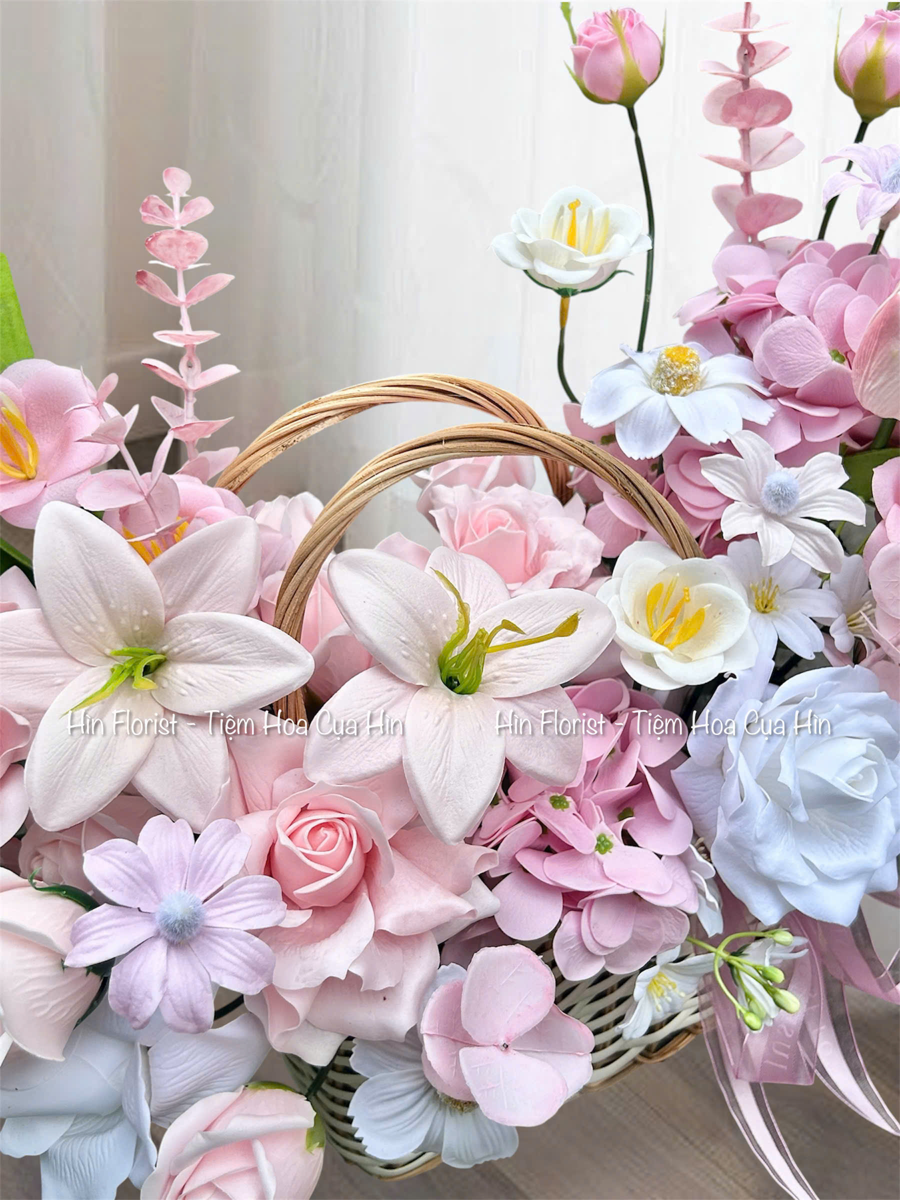 Giỏ hoa sáp mix hồng trắng 48B được tạo nên từ những bông hoa sáp thơm cao cấp (Xem chi tiết hoa sáp thơm là gì tại đây) và hoa tulip cao su non. Cũng như giấy gói và phụ kiện chính, hoa sáp mà Hìn Florist sử dụng là sản phẩm được nhập khẩu. Hương thơm và màu sắc của hoa sáp không thua kém gì hoa tươi sẽ khiến bạn vô cùng ngạc nhiên khi nhận được sản phẩm.