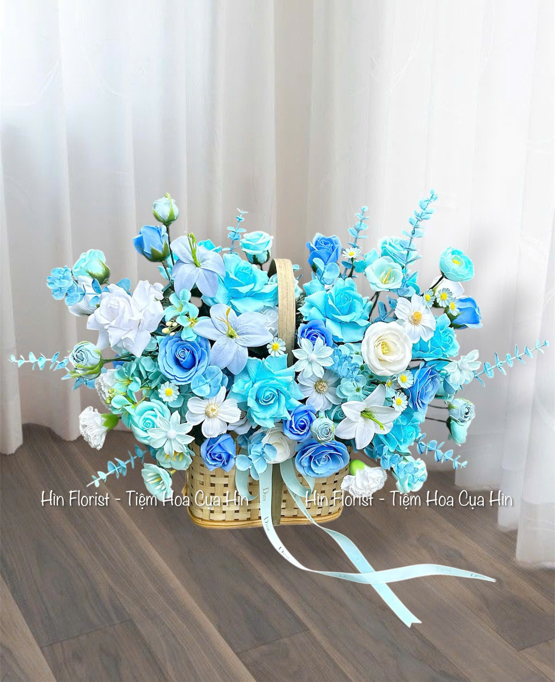 Lẵng hoa sáp xanh dương nhạt được tạo nên từ những bông hoa sáp thơm cao cấp (Xem chi tiết hoa sáp thơm là gì tại đây). Cũng như giấy gói và phụ kiện chính, hoa sáp mà Hìn Florist sử dụng là sản phẩm được nhập khẩu. Hương thơm và màu sắc của hoa sáp không thua kém gì hoa tươi sẽ khiến bạn vô cùng ngạc nhiên khi nhận được sản phẩm.