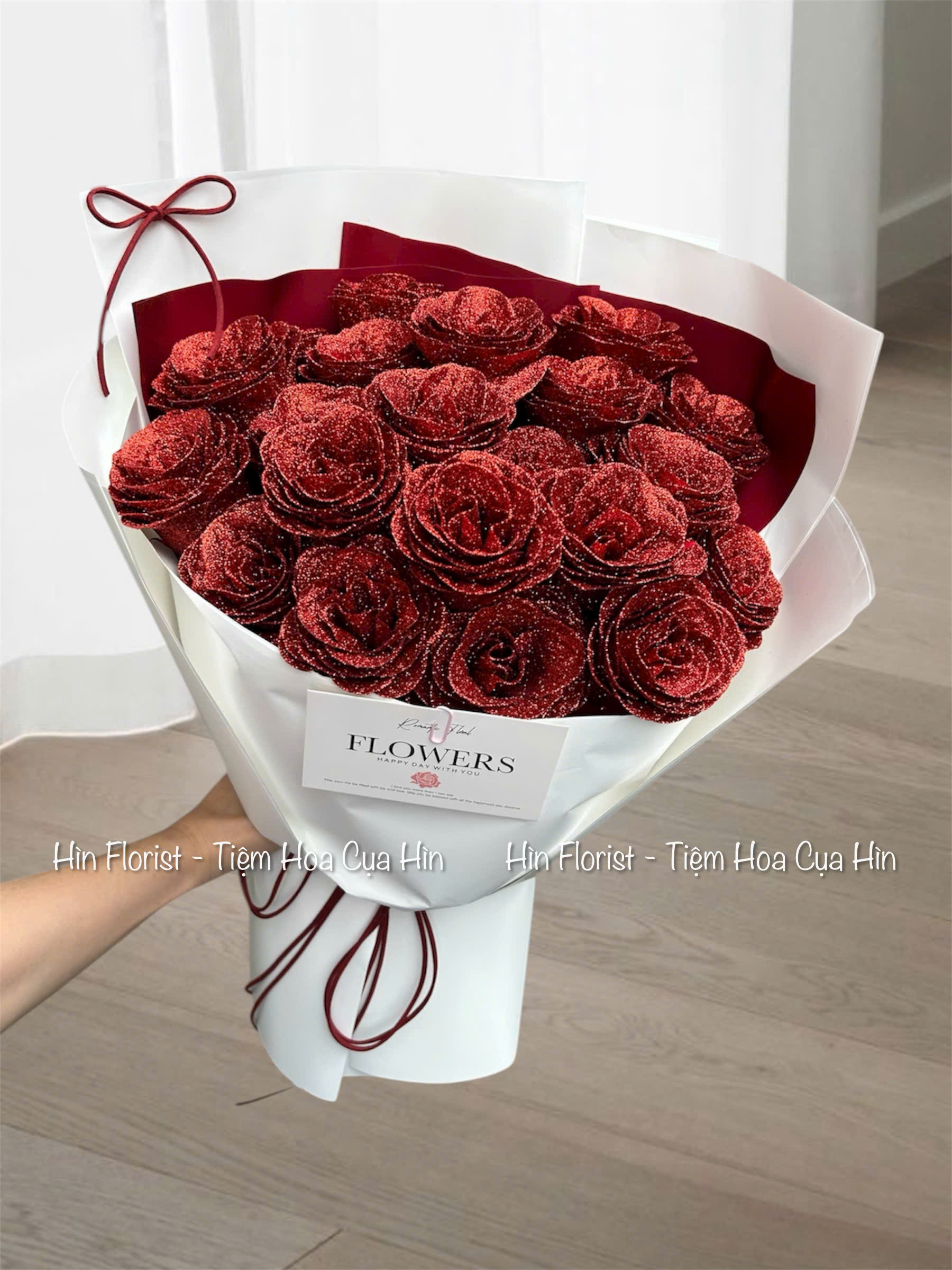 Là một phiên bản lấp lánh của hoa hồng. Bó 22 hoa kim tuyến đỏ được tạo nên từ những bông hoa sáp vải phủ nhũ dày, óng ánh, sang trọng và quyến rũ đến khó cưỡng. Kích thước loại hoa này lại lớn hơn hoa sáp thông thường với giá cả vô cùng hợp lý. Khác với hoa sáp, hoa nhũ kim tuyến không tan chảy khi gặp nước. Đây sẽ là một lựa chọn khá hấp dẫn cho khách hàng khi tìm kiếm 1 mẫu hoa giả sang trọng.